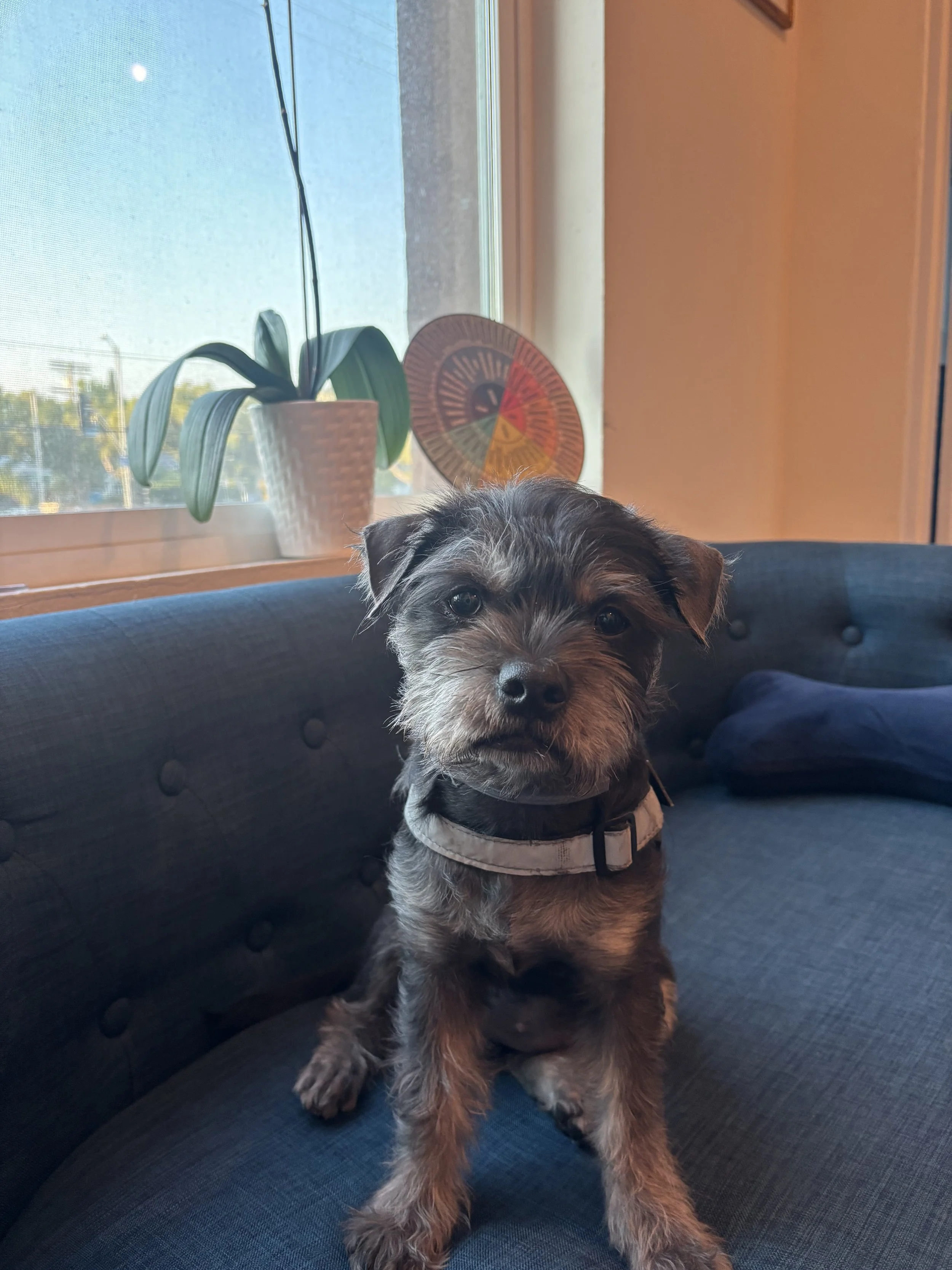 She sits with patients as they arrive, helping them settle after travel, softening the quiet anxieties people often carry in their bodies, and lifting spirits with her signature belly‑up welcome. Her presence invites you to breathe, drop into the moment, and feel a little more at ease.